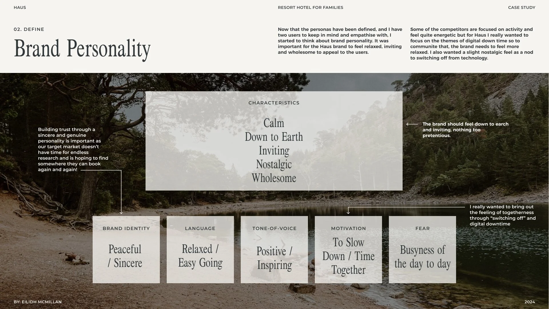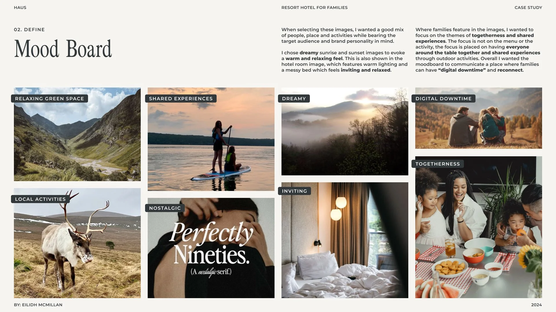 The next stage of the process was to take insights from the research to define both the personas and the brand personality. The goal was to emphasise the personas desire for calm and tranquility, away from the busyness of day to day life. Dreamy, relaxing tones and images of the family together were used to create a feeling of togetherness and calm.